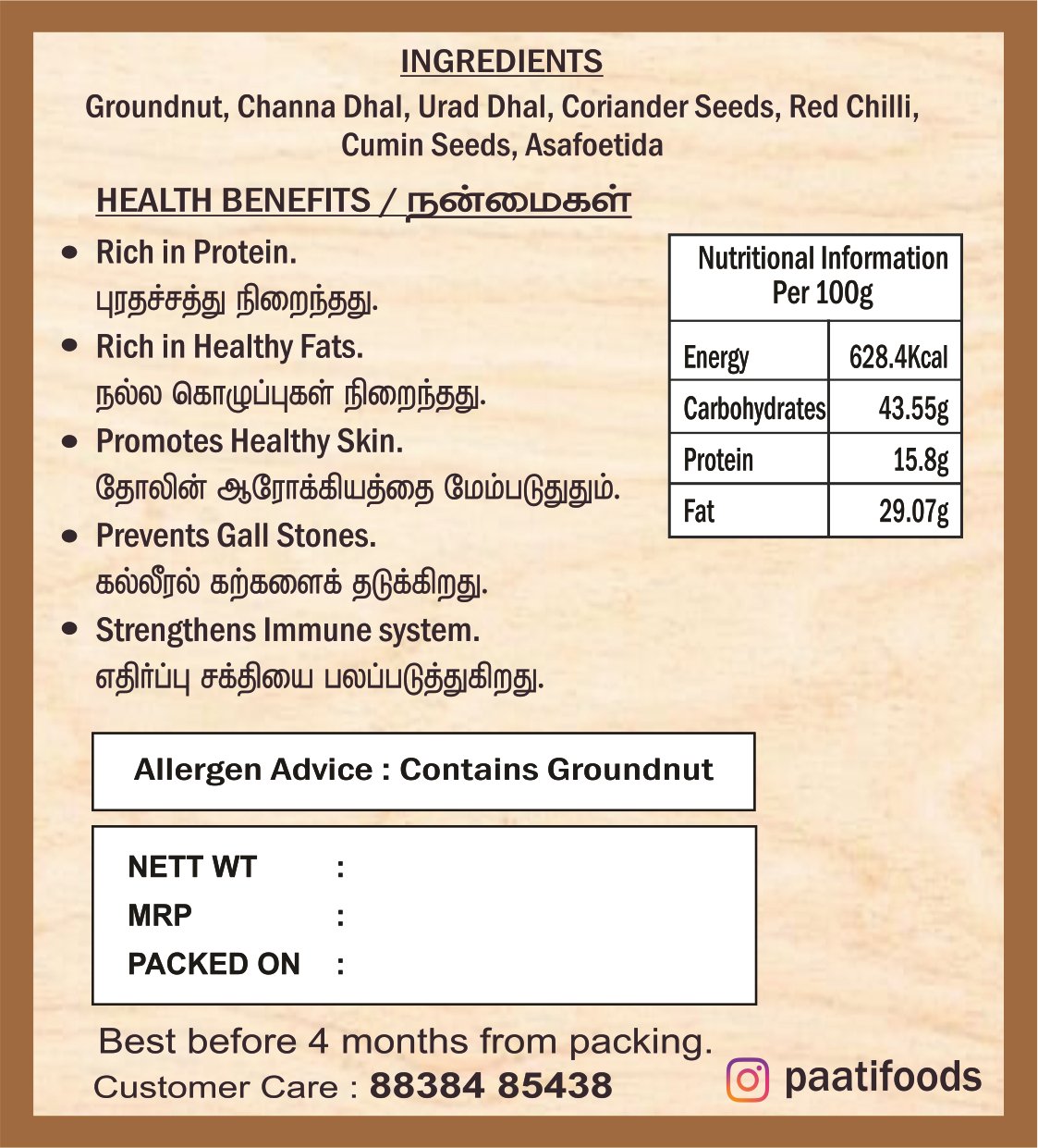 Our Groundnut Idly & Rice Podi is a wholesome South Indian spice mix crafted from roasted groundnuts and select spices. Packed with protein, healthy fats, and essential nutrients, it not only adds a nutty, flavorful crunch to your idly and rice but also promotes energy, digestion, and overall wellness. Perfect for a nutritious breakfast or quick meal, this podi brings both taste and health to your table.