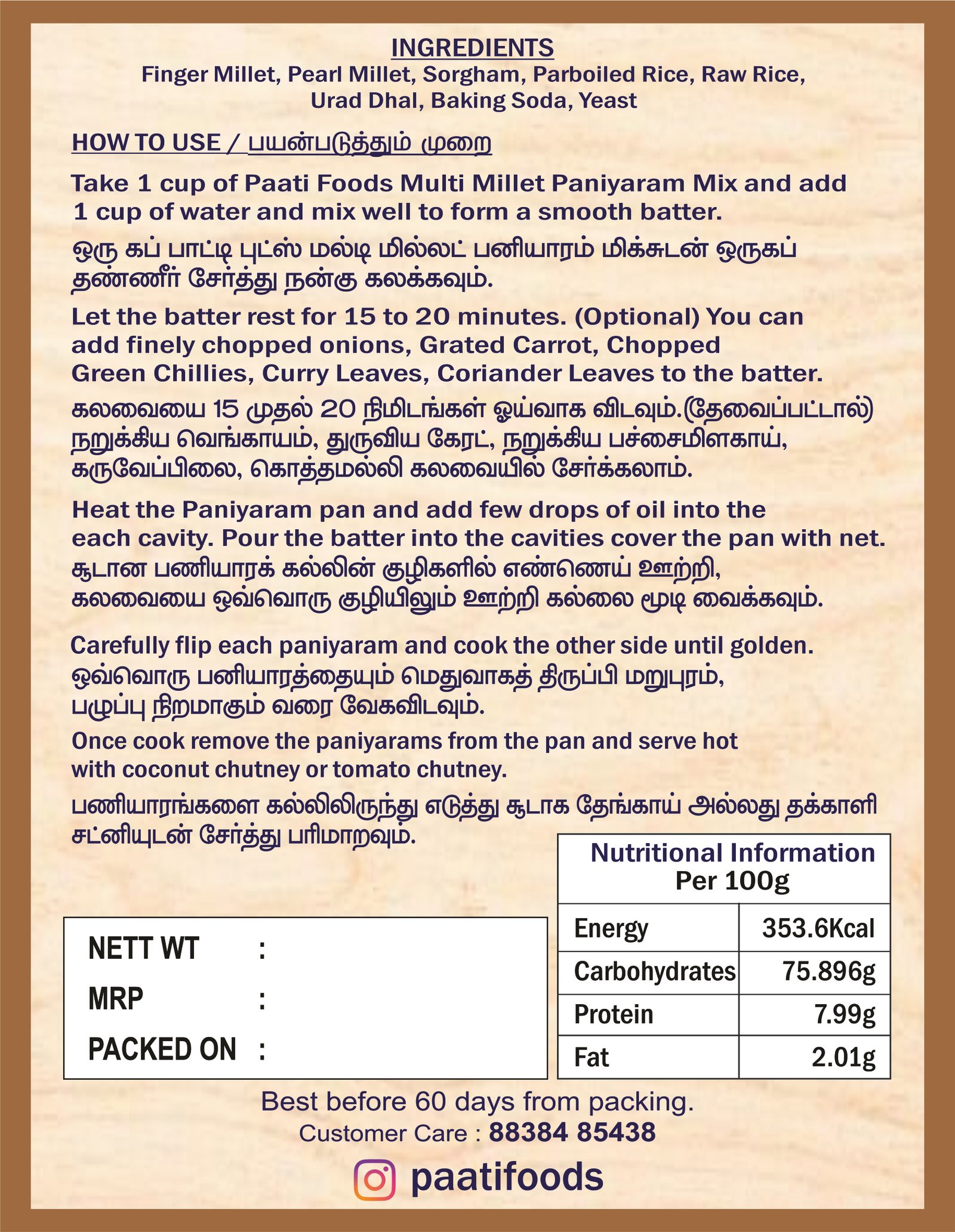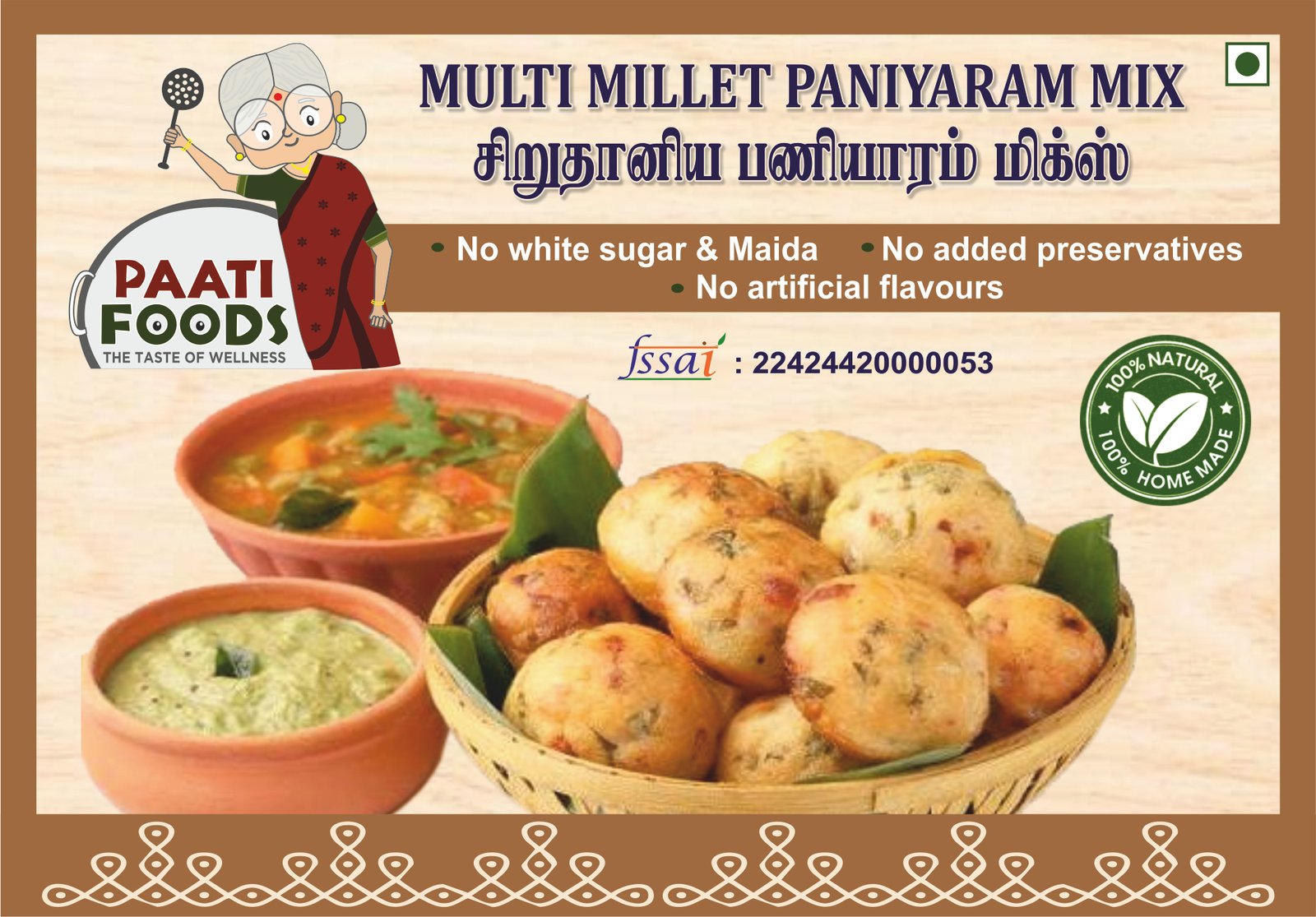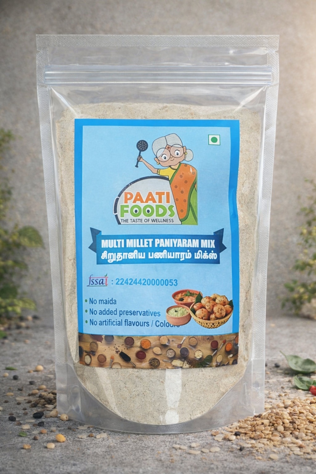 Our Multi Millet Paniyaram Mix is a nutritious and traditional South Indian blend made from a variety of wholesome millets and lentils, carefully processed to retain their natural goodness. Light, flavorful, and easy to digest, this mix delivers a perfect balance of taste and nutrition. Ideal for soft, crispy paniyarams, it makes a delicious choice for a healthy breakfast, evening snack, or light meal—combining tradition, health, and great taste in every bite.